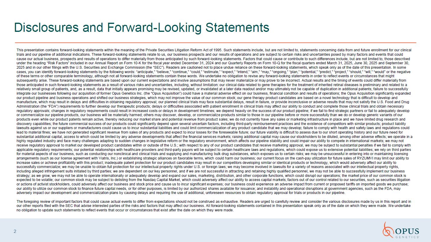 advantage in target IRDs Gene therapy programs target a potential $15 Billion+ U.S. sNDA submitted for partnered presbyopia treatment Financials Ticker: IRD Pro-forma cash & equivalents as of 9/30/2025: ~$54 million (including $23