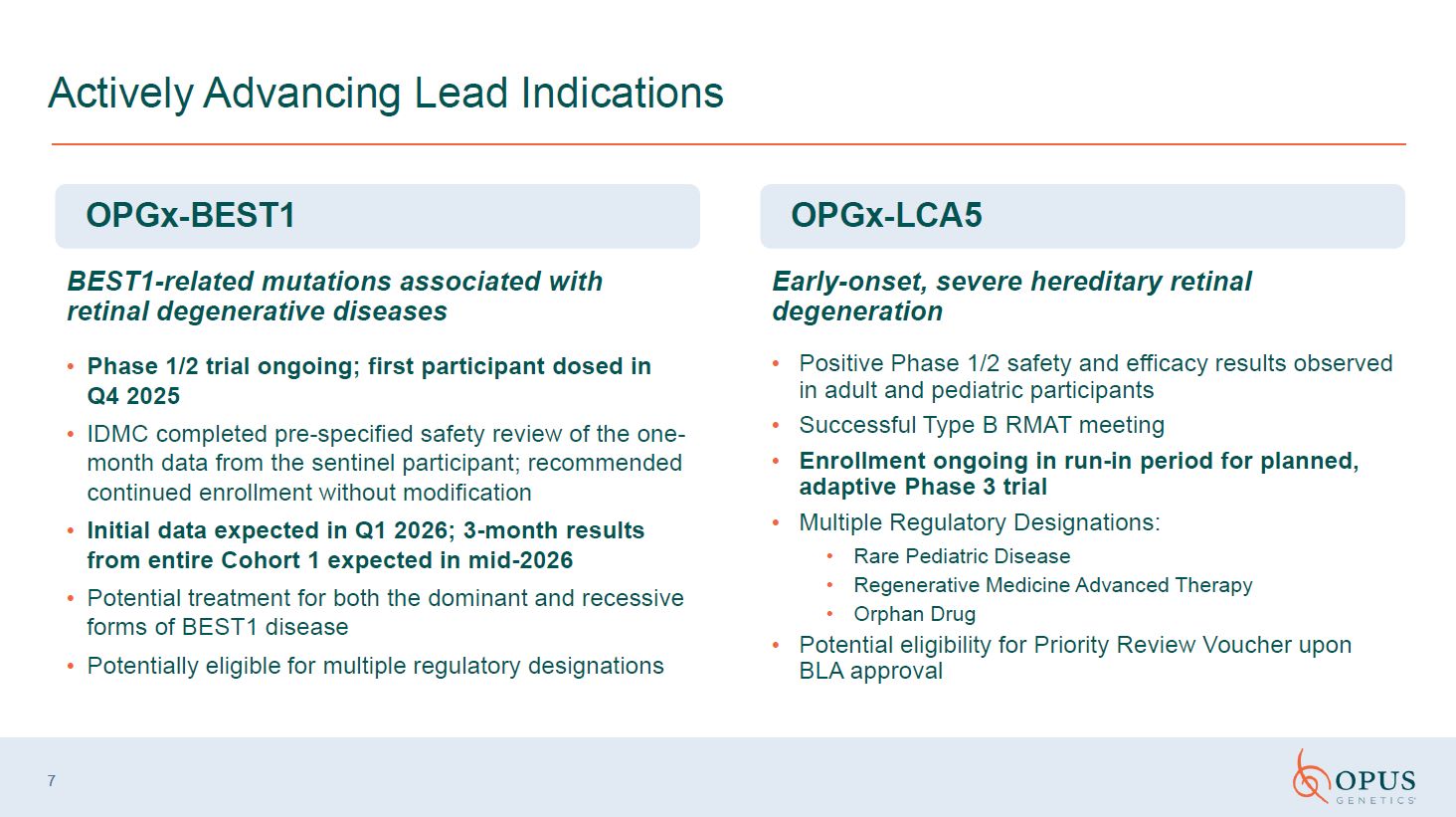 Medicine Advanced Therapy Orphan Drug Potential eligibility for Priority Review Voucher upon BLA approval OPGx-BEST1 Phase 1/2 trial ongoing; first participant dosed in Q4 2025 IDMC completed pre-specified safety review of the