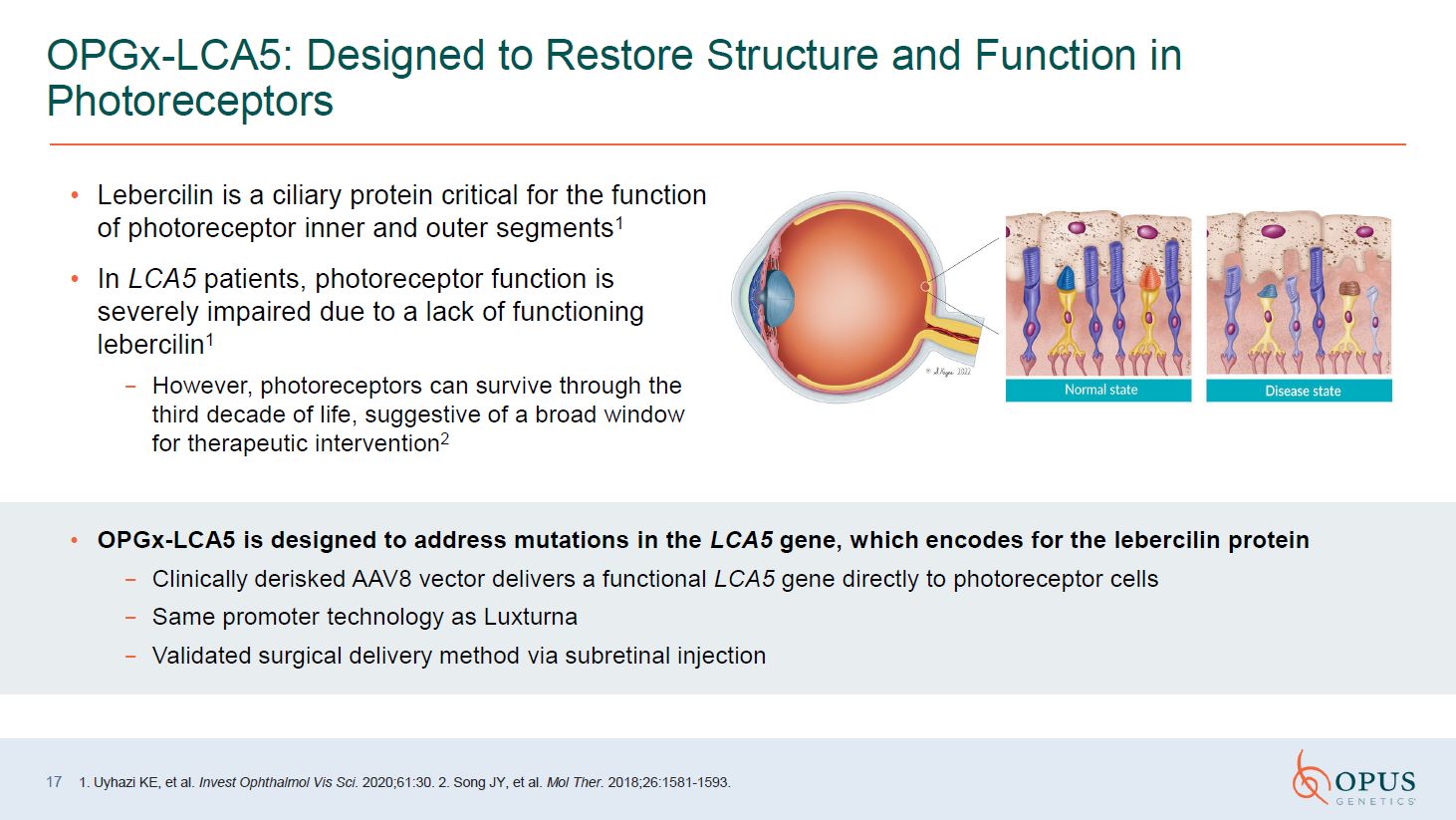 intervention2 17 OPGx-LCA5: Designed to Restore Structure and Function in Photoreceptors 1. Uyhazi KE, et al. Invest Ophthalmol Vis Sci. 2020;61:30. 2. Song JY, et al. Mol Ther. 2018;26:1581-1593. OPGx-LCA5 is designed to address
