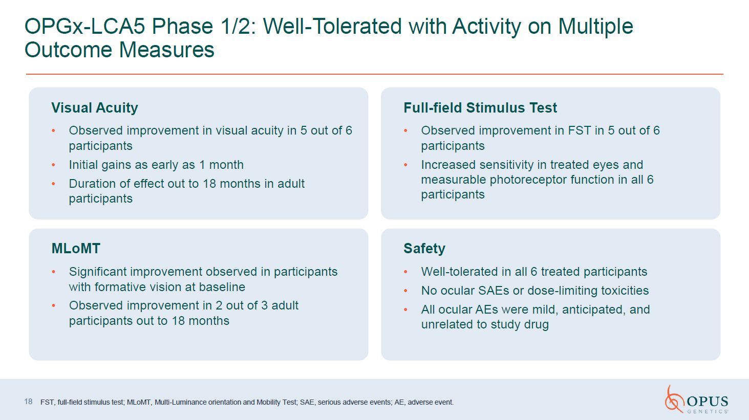 OPGx-LCA5 Phase 1/2: Well-Tolerated with Activity on Multiple Outcome