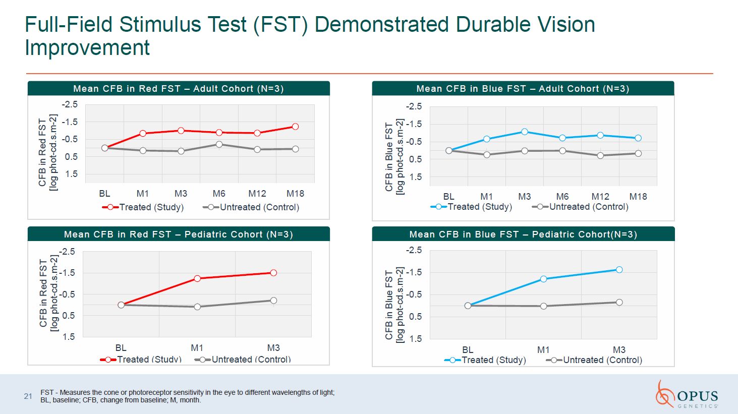 in Red FST – Adult Cohort (N=3) Mean CFB in Blue FST – Adult Cohort (N=3) Mean CFB in Red FST – Pediatric Cohort (N=3) Mean CFB in Blue FST – Pediatric Cohort(N=3) FST - Measures the cone or photoreceptor sensitivity in the eye to