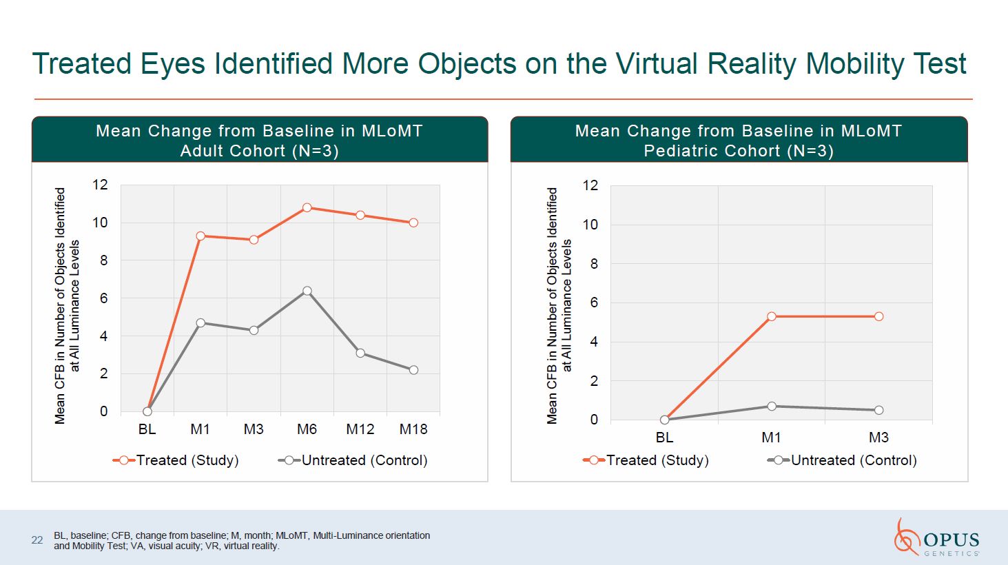 Change from Baseline in MLoMT Adult Cohort (N=3) Mean Change from Baseline in MLoMT Pediatric Cohort (N=3) BL, baseline; CFB, change from baseline; M, month; MLoMT, Multi-Luminance orientation and Mobility Test; VA, visual acuity; VR,