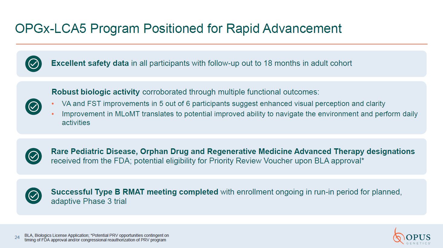 OPGx-LCA5 Program Positioned for Rapid Advancement 24 BLA, Biologics License