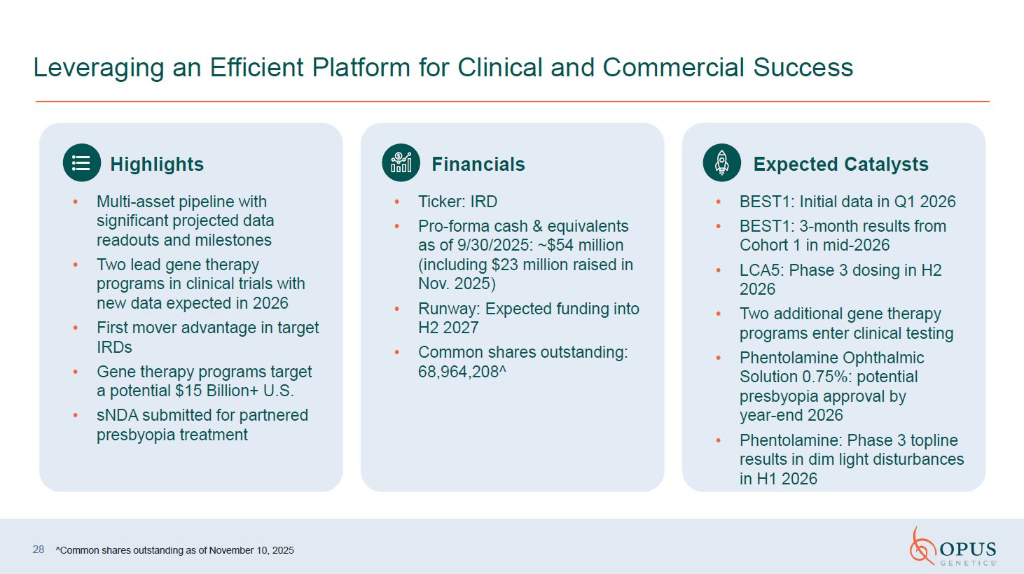 million raised in Nov. 2025) Runway: Expected funding into H2 2027 Common shares outstanding: 68,964,208^ Expected Catalysts BEST1: Initial data in Q1 2026 BEST1: 3-month results from Cohort 1 in mid-2026 LCA5: Phase 3 dosing in H2